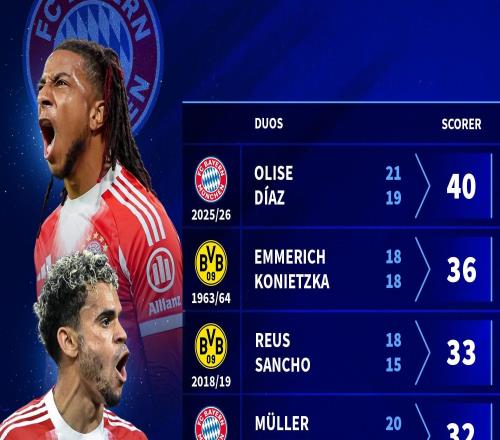 奥利塞和迪亚斯半程造40球德甲历史边锋组合第1,罗贝里仅23球